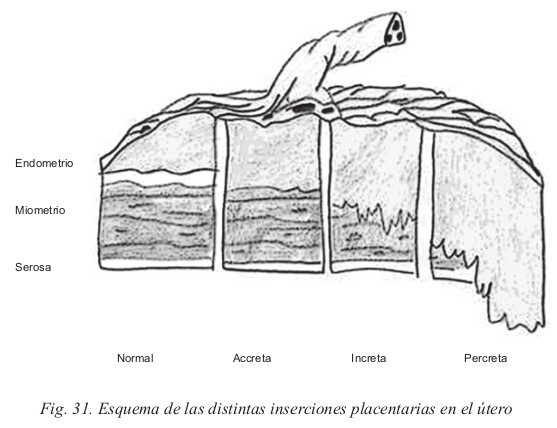 - Placenta increta. La placenta se inserta en el miometrio y penetra en él.