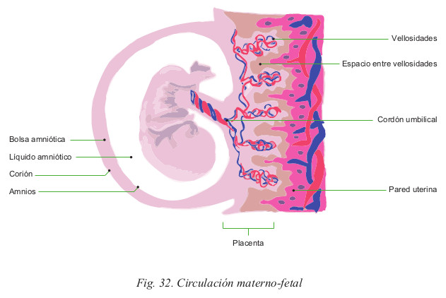 El flujo sanguíneo desde el embrión llega a los vasos que se localizan en las vellosidades. Los capilares de las vellosidades son ramas terminales de los vasos sanguíneos umbilicales. La sangre fetal desoxigenada llega por vía de las arterias umbilicales, y sale de la placenta con sangre oxigenada por una sola vena, la vena umbilical.
