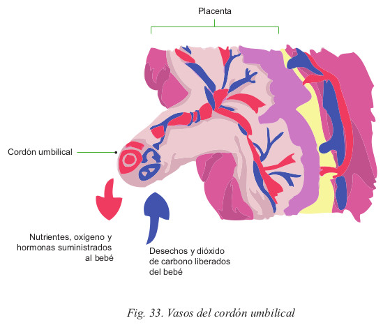 La sangre fetal es llevada a la placenta a través de las dos arterias umbilicales, y devuelta de la placenta al feto por la vena umbilical.