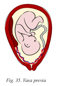 - Vasa previa. Se trata de vasos umbilicales que cruzan por delante de la presentación de forma anómala y después se introducen en el cordón umbilical. En el parto, si se rompe uno de estos vasos se puede producir una hemorragia importante y un sufrimiento fetal agudo.