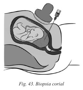 - Biopsia Corial. Tiene como objetivo la obtención de tejido placentario, por vía abdominal o por vía transcervical, para el estudio de los cromosomas fetales, o estudios más sofisticados como el ADN o enzimas fetales. Presenta una ventaja clara respecto a la amniocentesis: su realización es más precoz, en las semanas 11 y 12, con una tasa de complicaciones similar (Fig. 43).