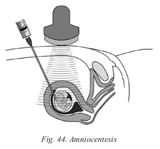 - Amniocentesis. Consiste en la obtención de líquido amniótico que rodea al feto, mediante una punción, a través del abdomen materno. Se realiza entre las semanas 15 y 18. El avance en el área de la Biología Molecular ha hecho posible la detección de alteraciones cromosómicas específicas en las células del líquido amniótico. Esta técnica conocida como Hibridación In Situ Fluorescente nos permite en el plazo de 24-48 horas, y con la misma técnica de recogida de líquido amniótico y la misma cantidad de muestra, realizar un análisis para los cromosomas implicados más frecuentemente en las alteraciones numéricas en recién nacidos (Fig. 44).