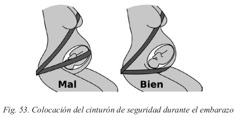 La banda ventral (pélvica o inferior) del cinturón de seguridad deberá pasar lo más bajo posible, evitando la presión directa sobre el útero. La banda diagonal (torácica) pasará centrada por la clavícula, entre las mamas y lateralmente por el abdomen (Fig. 53).