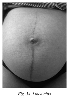 Estos cambios de pigmentación son más frecuentes en las mujeres de piel morena y en zonas como la línea de alba (Fig. 54), la vulva, la areola y los pezones.