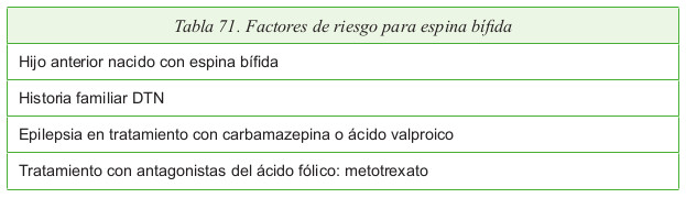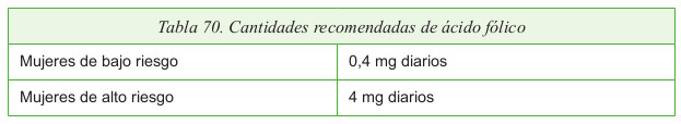Se recomienda la administración de ácido fólico para reducir la aparición de defectos congénitos en el recién nacido, fundamentalmente defectos del cierre del tubo neural (anencefalia, encefalocele, espina bífida), así como cardiopatías congénitas y labio leporino. La suplementación de ácido fólico se debe iniciar 1 mes antes de la concepción, hasta las 12 semanas de gestación (Tabla 70). Se recomienda la administración de ácido fólico en forma de monofármaco, ya que el exceso de otras vitaminas (A y D) pueden tener riesgos potenciales para la madre y el feto. Los factores de riesgo de espina bífida se muestran en la tabla 71.