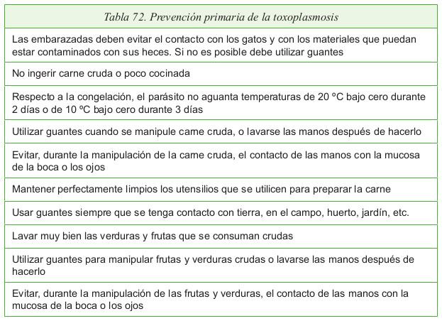 En las visitas del control prenatal se debe informar a las mujeres sobre la prevención primaria de la toxoplasmosis durante el embarazo (Tabla 72).