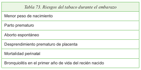 El embarazo es el momento adecuado para que la gestante y su pareja interrumpan el consumo de tabaco. En las consultas prenatales se debe informar, tanto a la gestante como la pareja si es fumadora, de los riesgos que presenta el tabaco para el embarazo y para el recién nacido (Tabla 73), de los beneficios que tiene su abandono y ofrecer apoyo para el proceso de deshabituación. Es aconsejable informarles de que no se recomienda permanecer en espacios cerrados con humo.