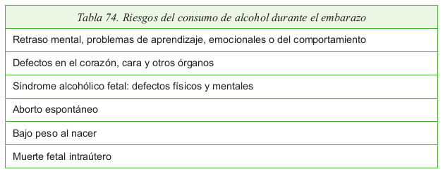 La matrona informará a las gestantes sobre los riesgos del alcohol durante el embarazo (Tabla 74), sobre la mayor probabilidad de efectos adversos en el primer trimestre de embarazo y sobre la no existencia de evidencia del nivel seguro del consumo de alcohol.