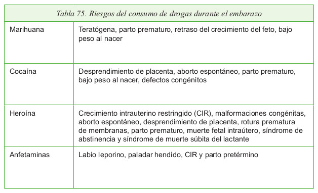 A pesar de que el tabaco y el alcohol son las sustancias más consumidas, existe un aumento creciente del consumo de otras sustancias. La gestante debe recibir información acerca de los riesgos que tiene el consumo de drogas durante la gestación (Tabla 75) y derivarla a un programa de deshabituación. Toda gestante adicta a drogas debe ser considerada de riesgo.
