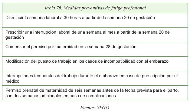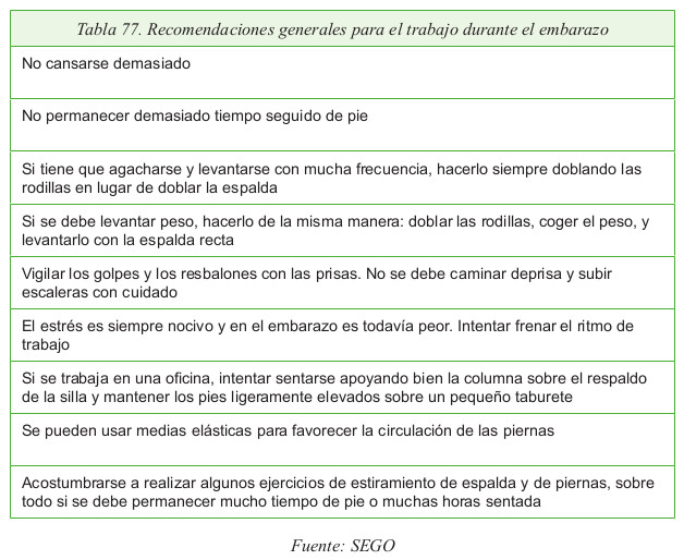 Si una mujer embarazada puede continuar realizando su trabajo o no, debe individualizarse en función del tipo de trabajo, la edad de gestación y el estado psíquico de la mujer. Esta valoración se realizará en todas las visitas de embarazo. Durante el embarazo se puede desarrollar el trabajo habitual, laboral o doméstico, siempre que éste no cause fatiga física o psíquica excesiva (Tabla 76). La mayoría de las mujeres estarán en condiciones de trabajar hasta el octavo mes de embarazo. Es recomendable el descanso laboral en las últimas seis semanas de gestación, aspecto que recoge la legislación española. En la tabla 77 se resumen las recomendaciones generales para el trabajo durante la gestación.