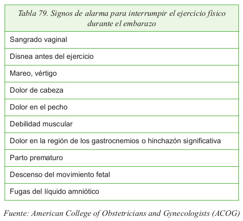 La evidencia científica hasta el momento no ha reportado ninguna complicación asociada a la práctica de ejercicio físico adecuada, ni para la madre, ni para el feto; excepto en diversas situaciones en las que se desaconseja el deporte (Tabla 79).