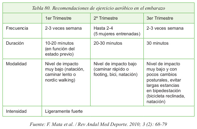 Los ejercicios acuáticos resultan una alternativa segura, con un bajo riesgo de lesión, y permiten combinar actividades aeróbicas con otras de fortalecimiento muscular (Fig. 52). La bicicleta estática, el paseo, el yoga y el baile son también actividades muy seguras durante el embarazo. Los ejercicios de Kegel, para el fortalecimiento del suelo pélvico, se deben realizar antes, durante y después del embarazo. Las recomendaciones del ejercicio aérobico durante el embarazo se resumen en la tabla 80.