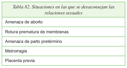 Antiguamente las relaciones sexuales estaban desaconsejadas durante los tres primeros meses y las últimas seis semanas antes del parto. Actualmente, la evidencia científica no desaconseja las relaciones sexuales, tan sólo en algunas situaciones (Tabla 82).