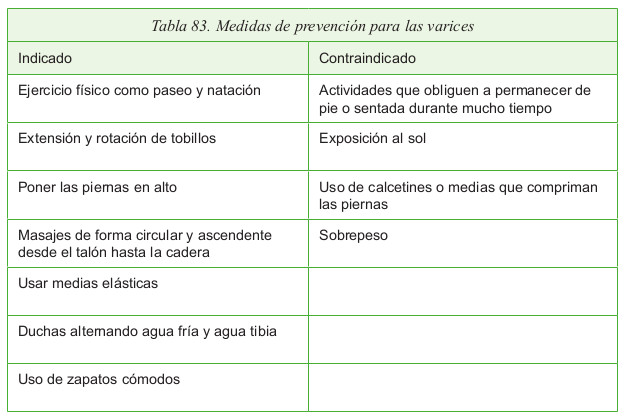 El embarazo actúa como desencadenante de las varices en mujeres que ya presentaban un cuadro de insuficiencia venosa latente. Las medidas de prevención para la aparición de varices se muestran en la tabla 83.