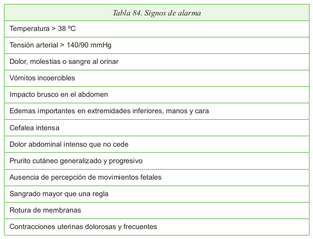 La gestante debe conocer los signos de alarma por los que deba acudir al hospital, ya que esto disminuye la ansiedad a la hora de afrontar los cambios del embarazo (Tabla 84).