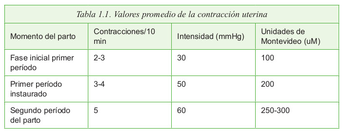 Los valores promedio de la actividad uterina oscilan entre las 100 Unidades de Montevideo al inicio del trabajo de parto hasta valores 250-300 Unidades de Montevideo.