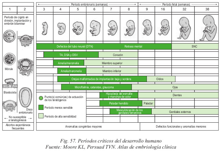 El embarazo representa un problema terapéutico único porque hay dos pacientes involucrados, la madre y el feto. Es un periodo crítico para la administración de medicamentos ya que muchos de ellos pueden ocasionar graves malformaciones en el feto, especialmente si son administrados durante el primer trimestre del embarazo (Fig. 57) y, por otra parte, otros muchos si se administran (sobre todo de manera continuada) durante las últimas semanas de gestación, pueden favorecer la aparición de complicaciones en el parto y puerperio.
