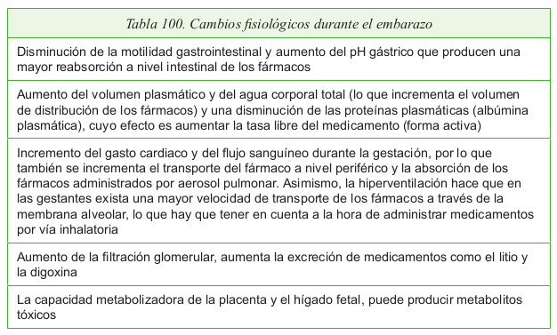 Durante la gestación se producen cambios fisiológicos en la gestante que pueden interferir en la farmacocinética de los fármacos empleados (Tabla 100).