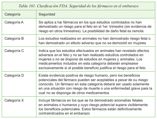 En 1979 la Food and Drug Administration (FDA) establece una clasificación de los fármacos según su seguridad en el embarazo, a raíz de la tragedia por el uso de la talidomida (Tabla 101). Existen varias clasificaciones, pero esta es la más empleada y la más conocida.