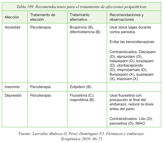 En la tabla 109 se muestran recomendaciones para el tratamiento de afecciones psiquiátricas.