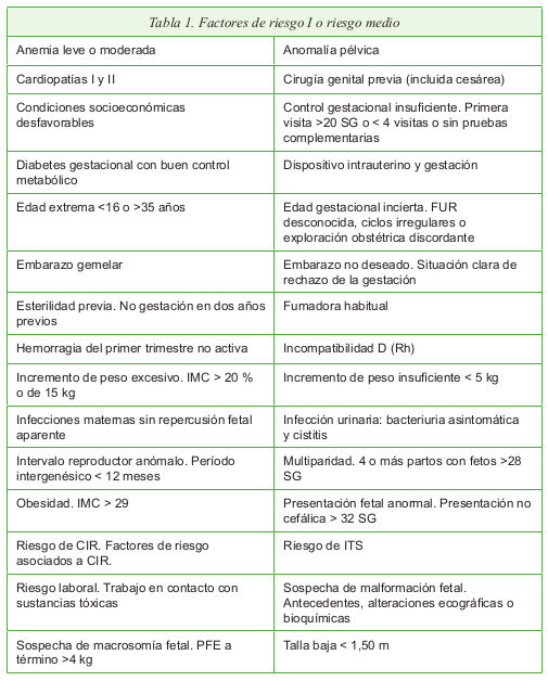 En el Proceso Asistencial Integrado sobre embarazo, parto y puerperio editado por la Junta de Andalucía en el año 2005, catalogaron los factores de riesgo en cuatro niveles. Siguen un orden creciente de probabilidad de aparición de complicaciones, tanto maternas como fetales, intentando de esta forma facilitar la organización de servicios de atención a la mujer embarazada. Un determinado factor de riesgo puede pertenecer a dos niveles asistenciales distintos, en función de la intensidad que posea y de la aparición de complicaciones. También evita la medicalización excesiva de embarazos que no lo requieren.