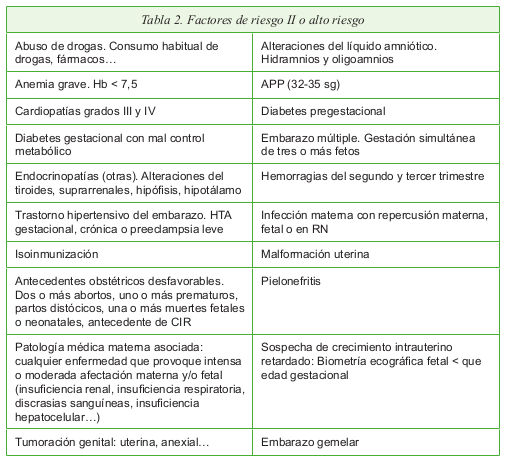 Poseen factores de riesgo de baja sensibilidad y especificidad. Los factores de riesgo de este grupo son bastante frecuentes y no se asocian necesariamente con un mal resultado del embarazo, pero su presencia hace más probable la aparición de complicaciones. Estas gestantes no requieren por lo general recursos altamente especializados y deberían ser vigiladas en las consultas de atención primaria y de obstetricia. También se han incluido en este grupo factores de riesgo con una mayor sensibilidad y especificidad, pero las gestantes que los poseen no requieren atención especializada hasta el tercer trimestre o durante el parto.
