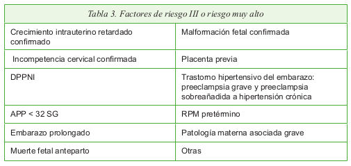 Gestantes con factores de riesgo poco frecuentes pero con una gran especificidad y/o sensibilidad. Estas gestantes tienen un aumento notable de la posibilidad de complicaciones durante el embarazo y el parto. Además, suelen requerir recursos sanitarios habitualmente no disponibles en los Centros de Primer y Segundo Nivel, por lo que el control sanitario del embarazo debería realizarse por un Servicio de Alto Riesgo de Obstetricia o Tercer Nivel desde el inicio del mismo o desde el momento en que aparezca el factor de riesgo.