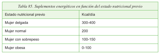 El aporte energético para una mujer no embarazada debe de ser de 2100-2200 kcal/ día, y para una mujer embarazada de 2300-2400 kcal/día. Para una ganancia de peso durante el embarazo alrededor de 12-13 kg, es necesario incrementar la dieta con 200- 300 kcal/día, sobre todo durante el segundo y tercer trimestre. Los requerimientos energéticos en el embarazo dependen del estado nutricional previo (Tabla 85).