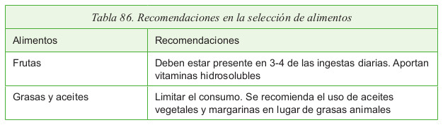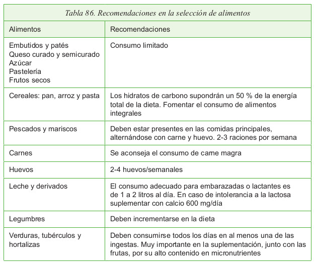 Los cereales, frutas, verduras, tubérculos, hortalizas y legumbres deben estar presentes en la dieta de una embarazada. Los huevos, la carne y el pescado no deben consumirse excesivamente. La pastelería, embutidos, patés, ahumados… deben consumirse esporádicamente. Las grasas saturadas y de origen animal deben evitarse. El consumo de leche semidesnatada o desnatada está indicado en el embarazo. Las recomendaciones en la selección de alimentos se muestran en la tabla 86.