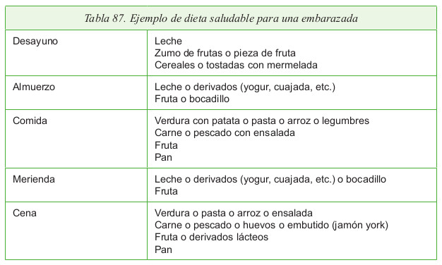 Algunas embarazadas tienen dificultades para almorzar y merendar; en estos casos se podrían suprimir estas dos comidas. Lo más recomendado es realizar 5 comidas al día: desayuno (20 %), almuerzo (10 %), comida (30 %), merienda (10 %) y cena (30 %). En la tabla 87 se muestra un ejemplo de dieta para el embarazo.