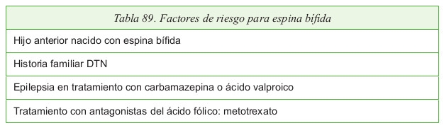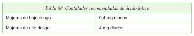 El Ministerio de Sanidad, Política Social e Igualdad recomienda la ingesta de un suplemento de 0,4 mg de ácido fólico al día a toda mujer que esté planeando un embarazo (Tabla 88). En aquellas con antecedentes de DTN, la dosis será de 4 mg/ día (en España se dispone de preparados de 5 mg) (Tabla 89). Independientemente de esto, se aconseja a todas las embarazadas la ingesta de alimentos que aporten ácido fólico, especialmente vegetales de hoja verde, hígado, frutas, cereales, legumbres, levaduras y frutos secos. Se recomienda la administración de ácido fólico en forma de monofármaco, ya que el exceso de otras vitaminas (A y D) pueden tener riesgos potenciales para la madre y el feto.