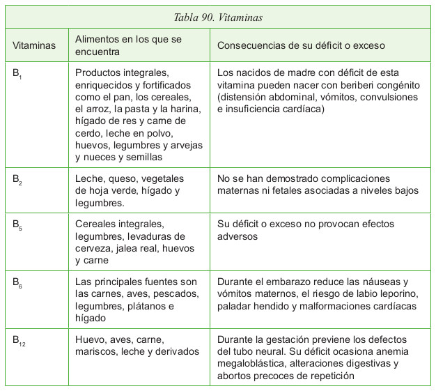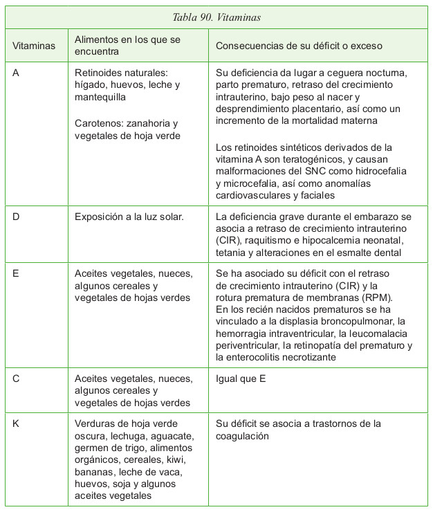 La suplementación con vitamina A, D, E, C, K, B1, B2, B5, B6 y B12 no está recomendada según la evidencia actual. En la tabla 90 se resumen las consecuencias del déficit y del exceso de vitaminas durante el embarazo (Tabla 90).