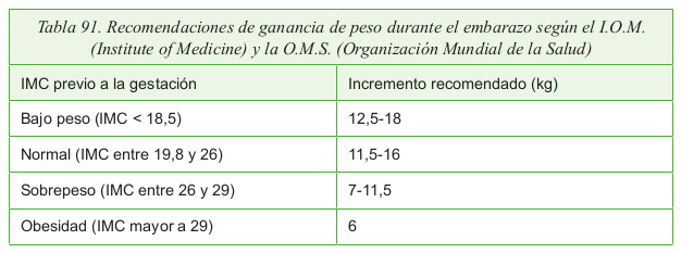 La ganancia de peso recomendada en el embarazo depende del IMC previo a la gestación (Tabla 91).