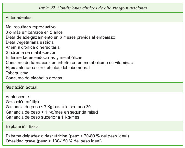 Diversas situaciones especiales asociadas a la ingesta de fármacos, a las características del embarazo o la exploración física de la gestante pueden desembocar en una situación de riesgo nutricional (Tabla 92).