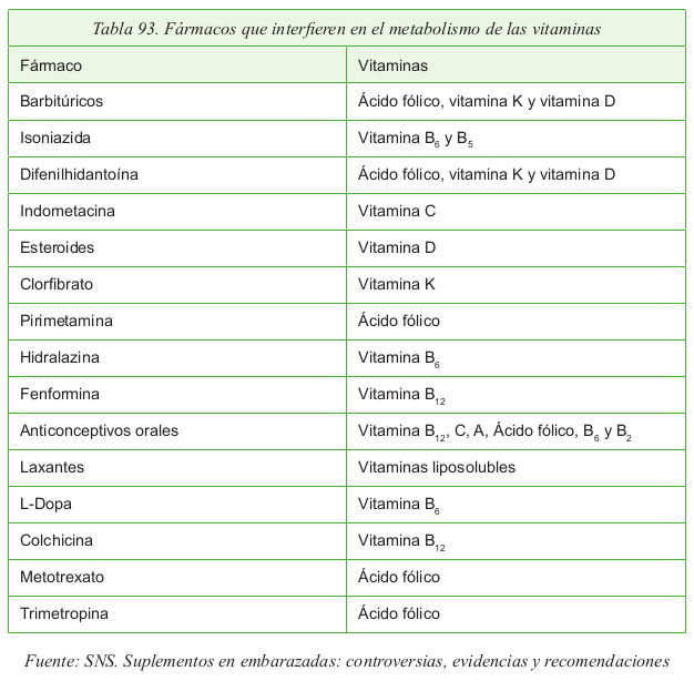 Ciertos tratamientos farmacológicos interfieren con el metabolismo de algunas vitaminas (Tabla 93).