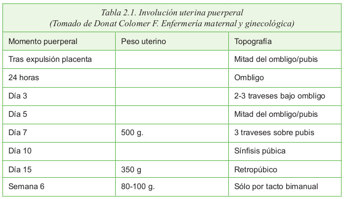 A lo largo de este periodo, su volumen disminuye 100 veces y su peso 10 veces; pasa de pesar 1.000 g a 100 g. Los cambios en el tamaño uterino, se deben principalmente a que se reduce la longitud del útero, ya que el diámetro transversal permanece relativamente constante durante el puerperio. El aumento del tejido conectivo y la elastina en el miometrio, así como el aumento de la vascularización y de las células miometriales que no vuelven a tener exactamente su tamaño previo, hacen que al final de la involución puerperal el útero sea algo mayor que antes del embarazo. (Tabla 2.1).