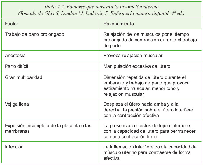 Los factores que favorecen la involución uterina incluyen un trabajo de parto y parto sin complicaciones, la expulsión completa de los productos de la concepción, la lactancia materna y la deambulación temprana. Y los factores que retrasan dicha involución los vamos a describir en la siguiente tabla: