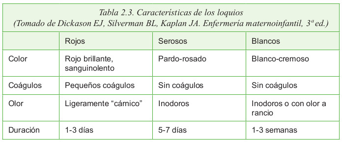 - Loquios rojos o “lochia rubra”, que duran de 2 a 3 días. Contienen sangre casi exclusivamente, con pequeños fragmentos de membranas y restos fetales como lanugo, vérmix, y meconio.