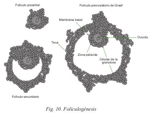 - Prenatal o período de proliferación. Empieza cuando las células germinales primordiales colonizan el lugar donde se originarán los ovarios; allí las células realizan divisiones mitóticas sucesivas y forman las ovogonias; éstas se encuentran en el interior de los folículos, al tercer mes de embarazo aumentan de tamaño y duplican sus cromosomas y originan los ovocitos de primer orden; se inicia la primera división meiótica.