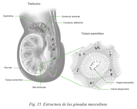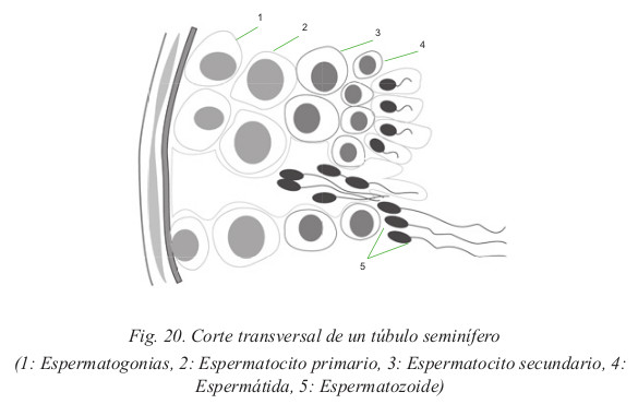 La formación de los espermatozoides tiene lugar en las gónadas masculinas: los testículos. En el ser humano, los testículos son órganos compuestos por numerosos túbulos seminíferos que convergen en conductos comunes que llevan el esperma maduro al exterior. El examen microscópico de estos túbulos seminíferos permite reconocer fácilmente el curso de la espermatogénesis y distinguir sus diferentes fases (Fig. 20).