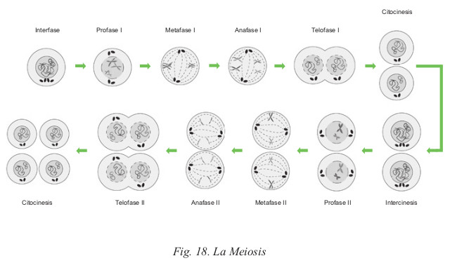 La meiosis (Fig. 18) consta de dos divisiones sucesivas de una célula diploide (2n) con una única replicación del ADN. El producto final son cuatro células haploides con n cromosomas. Así pues, consiste en una división del núcleo en dos secuencias, dando como resultado que el número diploide pase a ser haploide.