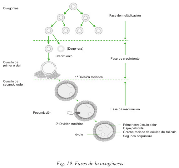 Proceso citológico de la ovogénesis. Sin tener en cuenta la diferencia de madurez sexual y considerando la ovogénesis como un proceso citológico de división celular sin ninguna pausa, las fases en las que se divide ésta son (Fig. 19):