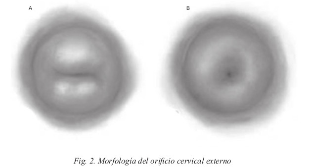 El cuerpo y el cuello uterino están tunelizados en su centro (cavidad cervical). Esta cavidad tiene forma cilíndrica y comunica la cavidad corpocervical con la vagina. La extremidad superior de la cavidad cervical o zona de unión con el istmo se denomina Orificio Cervical Interno OCI, y la extremidad inferior Orificio Cervical Externo OCE, que tiene morfología distinta según la paridad de la mujer: en las nulíparas es puntiforme (B) y en multíparas tiene una forma de hendidura transversal (A). Fig. 2.