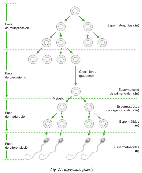Sin considerar, de igual manera que se ha hecho en la ovogénesis, la diferencia de madurez sexual y considerando la espermatogénesis como un proceso citológico de división celular sin ninguna pausa, las fases en las que se divide ésta son (Fig. 21):