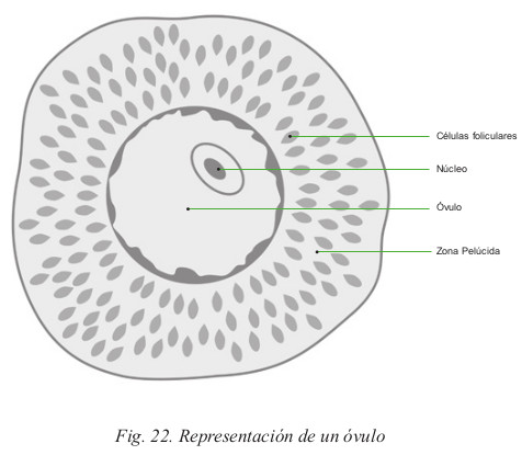 El óvulo es el gameto femenino que se ha formado en las gónadas femeninas, los ovarios, a lo largo de la vida fértil de la mujer. Se pueden distinguir varias partes dentro de un óvulo (Fig.22):