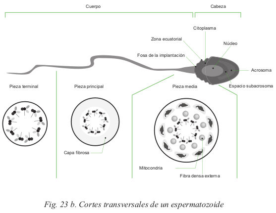Es el gameto masculino que se produce de forma continua en las gónadas masculinas, los testículos, gracias a la interacción con las hormonas cuando se alcanza la pubertad. Las partes de un espermatozoide son las siguientes (Fig. 23 a y b):