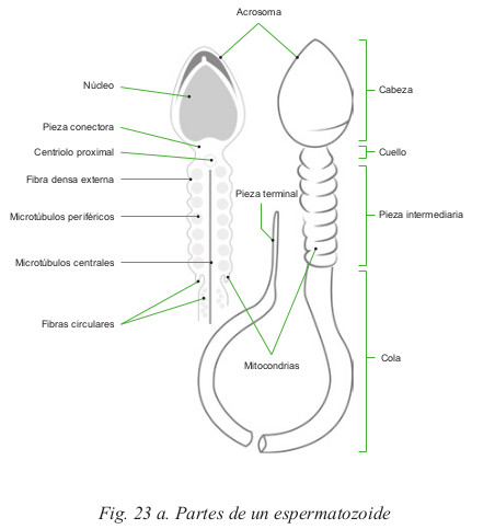 Es el gameto masculino que se produce de forma continua en las gónadas masculinas, los testículos, gracias a la interacción con las hormonas cuando se alcanza la pubertad. Las partes de un espermatozoide son las siguientes (Fig. 23 a y b):