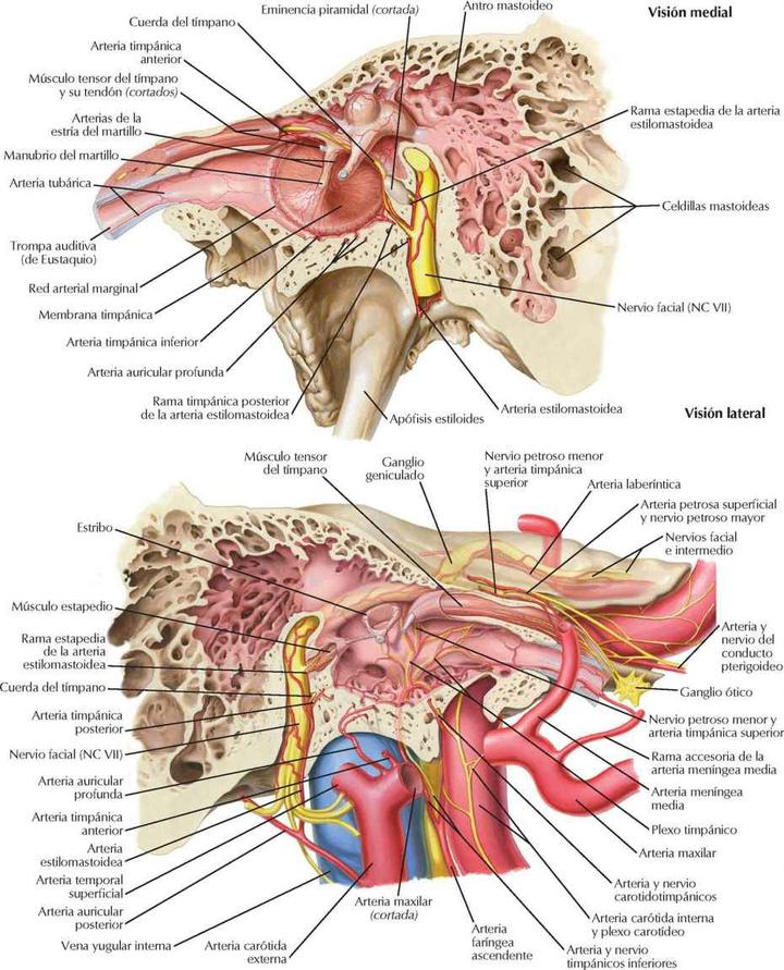 Diapositivas del oído (vía de recepción del sonido en la cóclea, cavidad timpánica, laberintos óseo y membranoso, orientación de los laberintos en el cráneo).